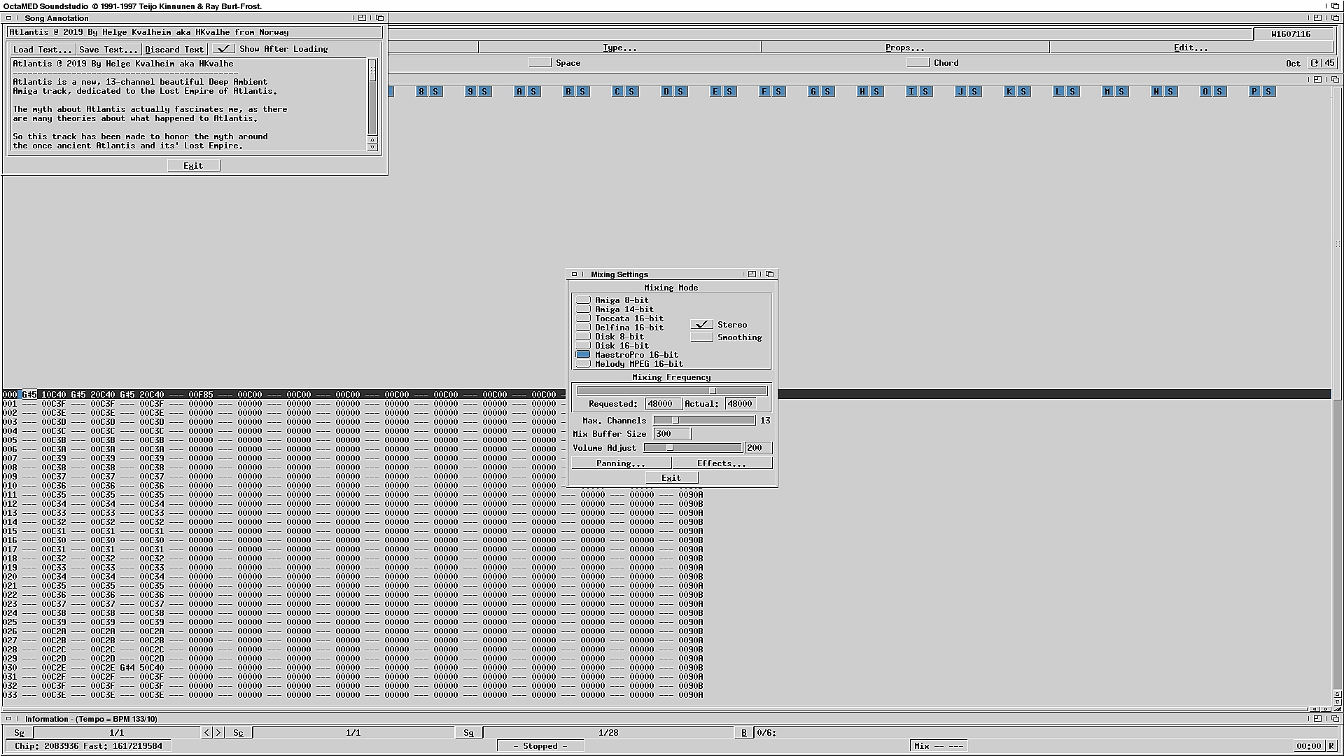 My AmigaOne 500 aka SAM460ex running OctaMED SoundStudio v1.03c under AmigaOS 4.1 Final Edition Update 1 and Workbench Enhancer 1.5. A unique AHI tool called TheMaestrix is placed in WBStartup, to allow OctaMED SoundStudio v1.03c to think that my 24-bit ESI@Juli XTe PCIe audio card, actually is a 16-bit Maestro Pro Soundcard! That way, I'm allowed to get audio in OctaMED SoundStudio v1.03c using this mode!