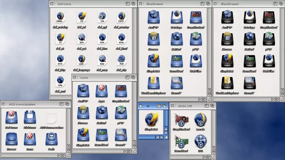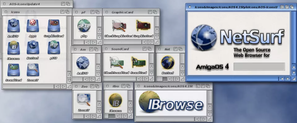 - Icons for AmiFTP, GraphicsCard, IBrowse, NetSurf, pFTP, SimpleCat, SoundCard and ZoomIT