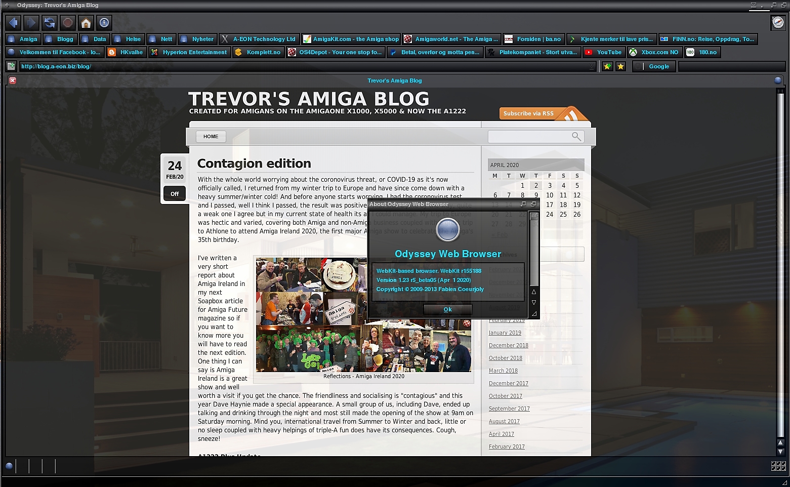 My AmigaOne 500 aka SAM460ex running latest Odyssey Web Browser 1.23r5 Beta 5 under AmigaOS 4.1 Final Edition Update 1 and Workbench Enhancer 1.5. This version of Odyssey is the fastest and the best yet! Checking Trevor's Blog.