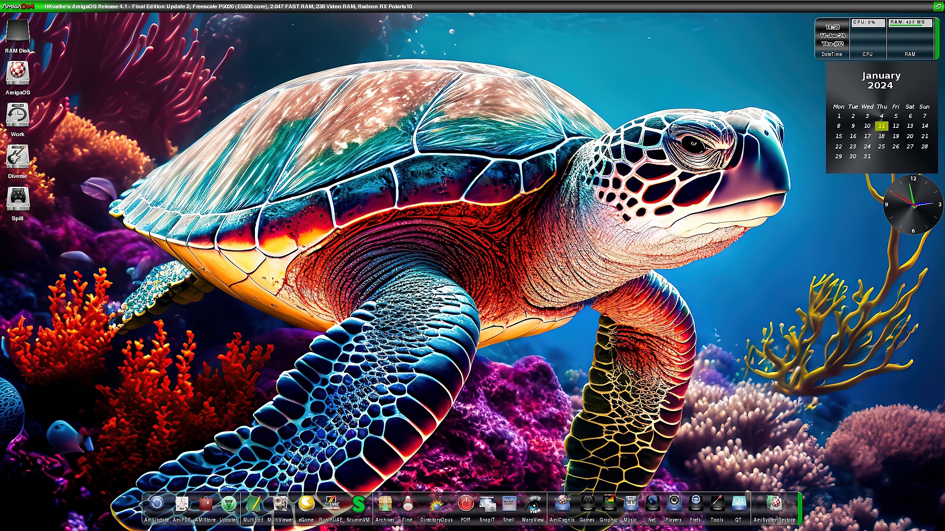 1920x1080p 32bit screenshot of my AmigaOne X5000/20 running the Sea Turtle wallpaper in latest AmigaOS 4.1 Final Edition Update 2 with Enhancer 2.2.